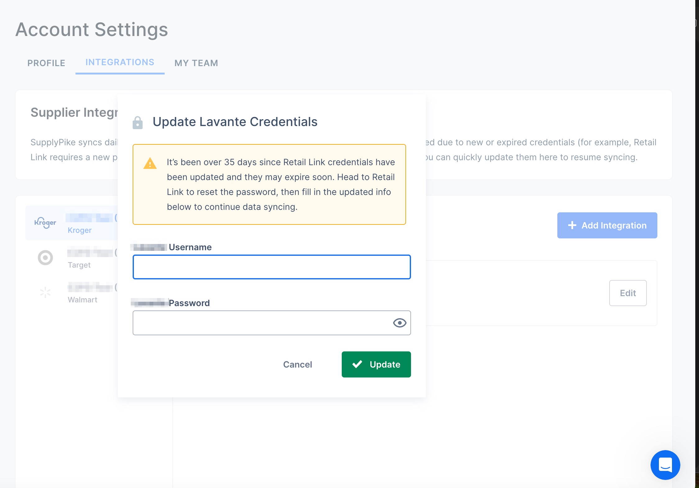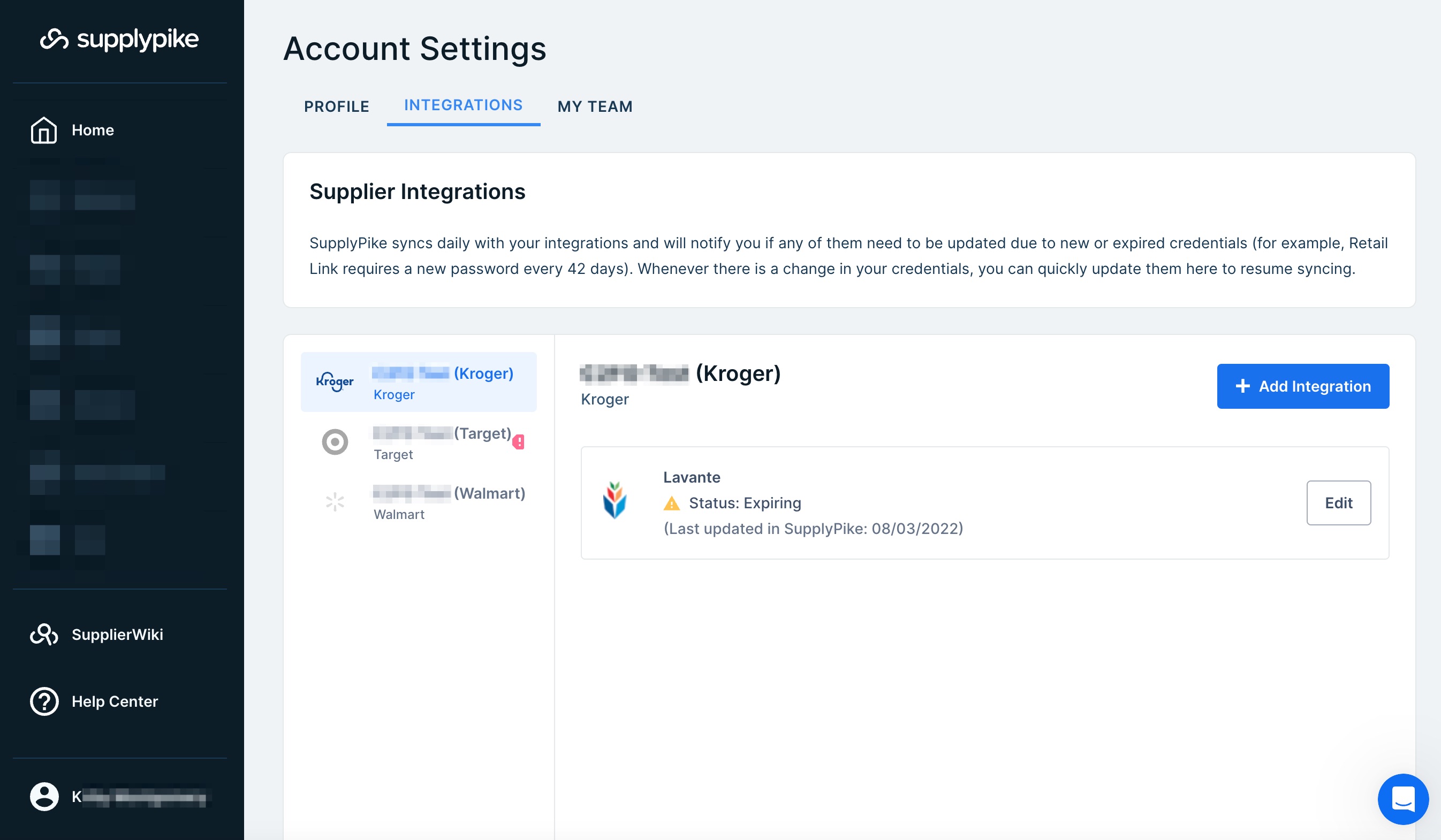 One of the best UI examples of managing connections to portals comes from our friends at SupplyPike. Their team is best-in-the-business at communicating with users their active integrations and the integrations that need to be corrected. Here are examples of that UX: